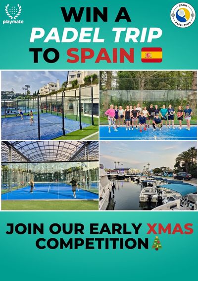 From the 20th of November till the 20th of January 2026, every match you play with Playmate Padel, will count as an entry for a raffle draw, the winner of the raffle will win a fully paid Padel trip to Spain!